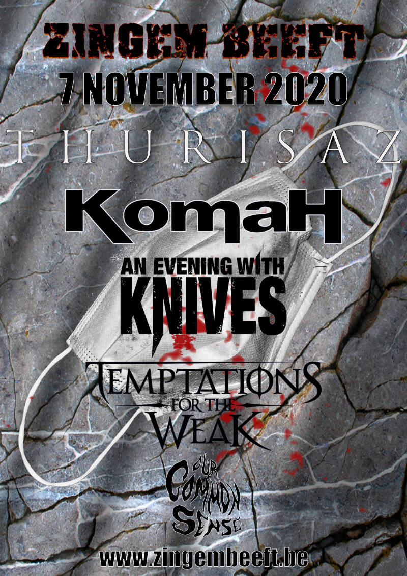 We laten zanger/gitarist Marco Gellissen van An Evening With Knives zelf aan het woord:"Damn, we HATE cancelling shows but unfortunately, in the first time of AEWK history, we have to cancel a show due to an agenda issue. Sad to announce that we won't be able to play Zingem Beeft Festival November 6th. Be sure to check out the festival with the awesome lineup (Thurisaz, Fire Down Below, Komah, Temptations for the weak, and Our Common Sense)* Hoping to see you guys as soon as the circumstances approve Stay safe!"